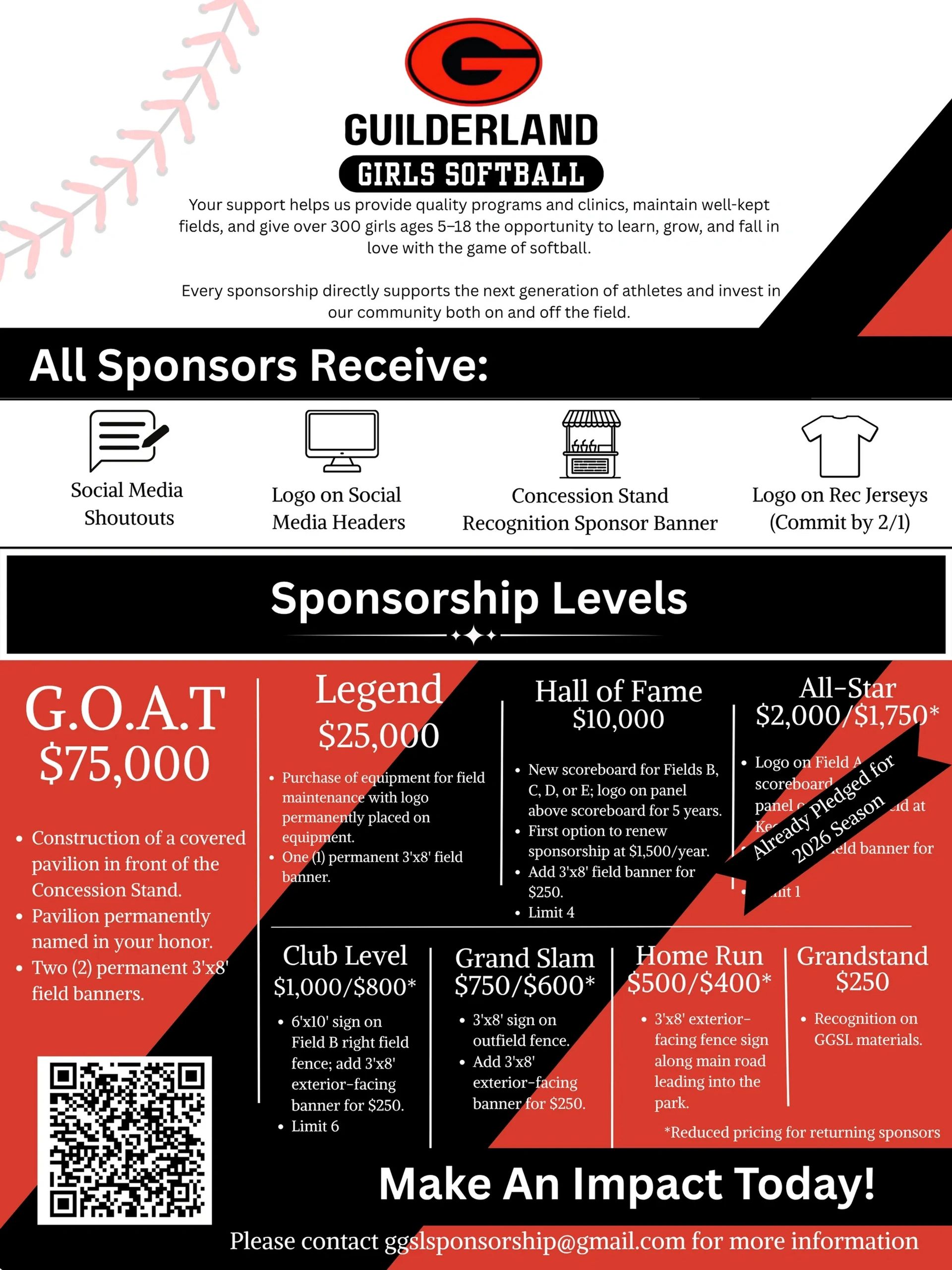 There is a limited (but growing) number of teams available. Your business will be displayed on our large sponsor plaque on the front of the concession stand and listed in our annual league booklet. Each player registered by February 1 will also receive a GGSL logo t-shirt with all the sponsors for that division listed on the back of their